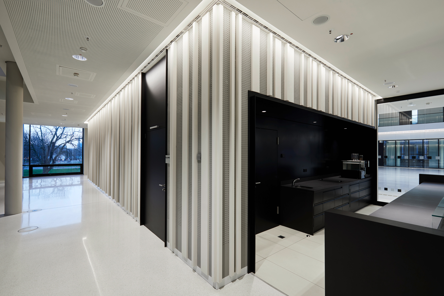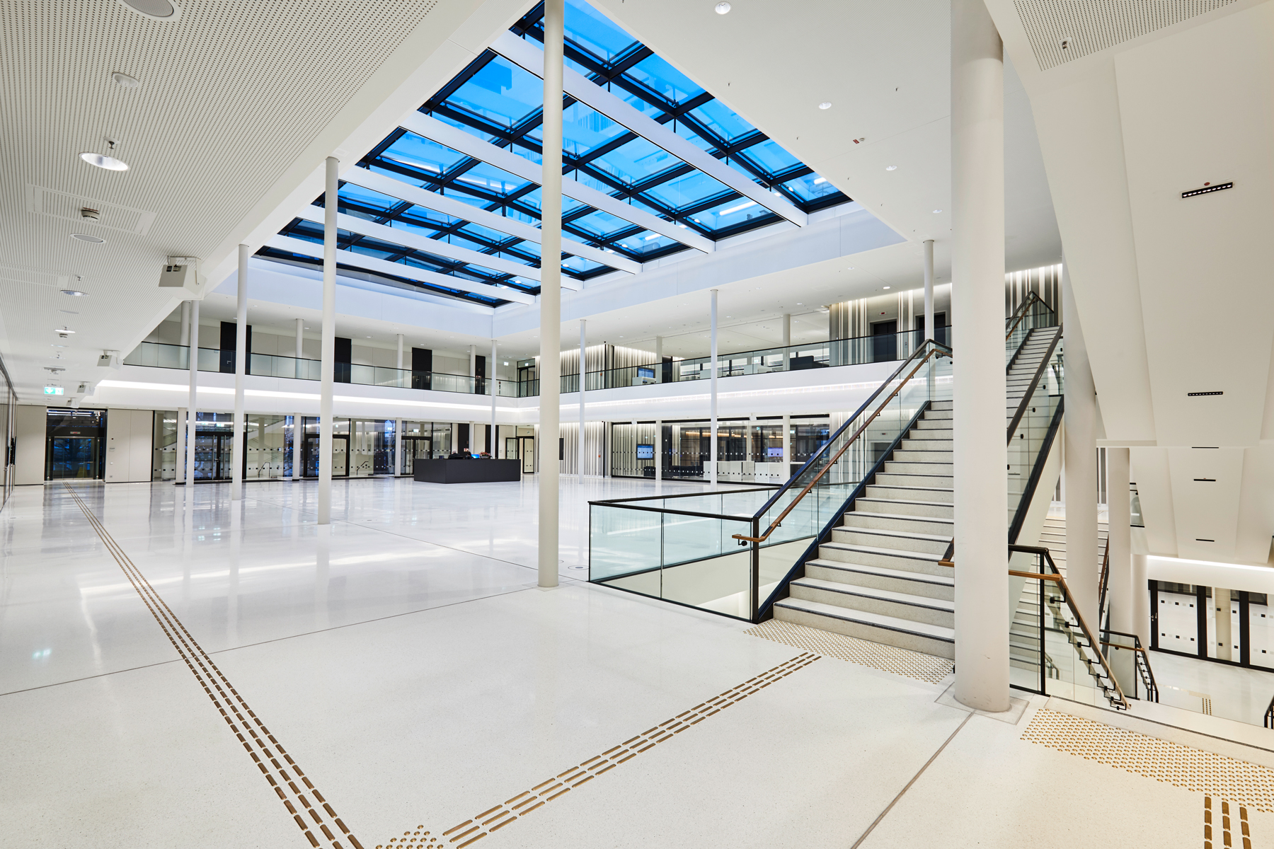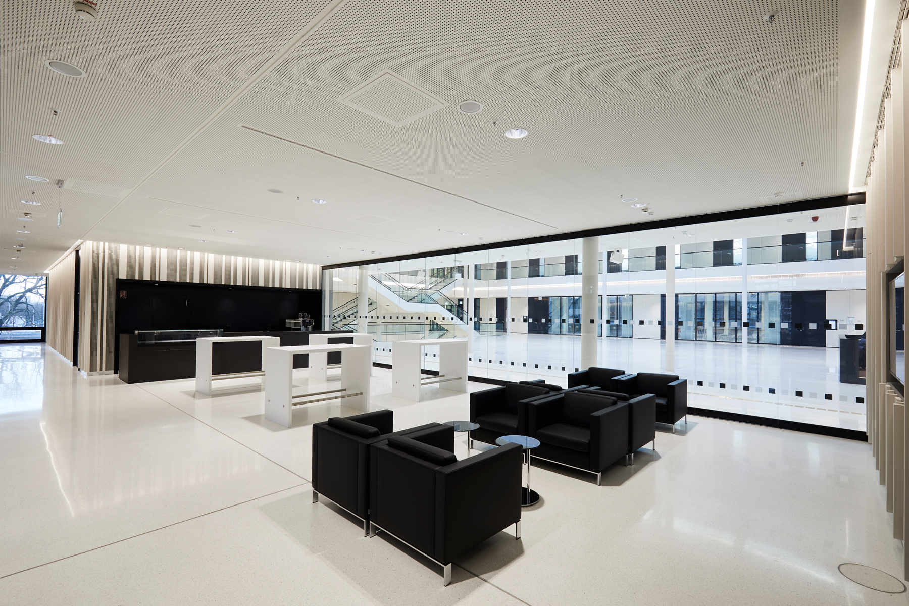 Light shapes the perception of space and creates atmosphere. Daylight is crucial for well-being. The plenary hall opens to the south over six façade-high windows to the square of the ‘Göttingen Sieben’ and is illuminated throughout the course of the year. Natural light develops its own character depending on the time of day. With complementary artificial light, consistent light conditions in daylight quality are achieved inside the hall, guaranteeing equally good working conditions, even on long days of meetings until the evening. A clearly structured lighting grid gives the plenary hall ceiling peace and continues into the ‘Portikushalle‘, the bistro and other secondary areas.