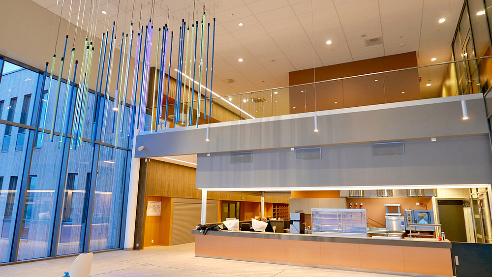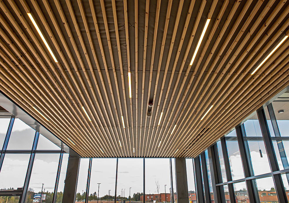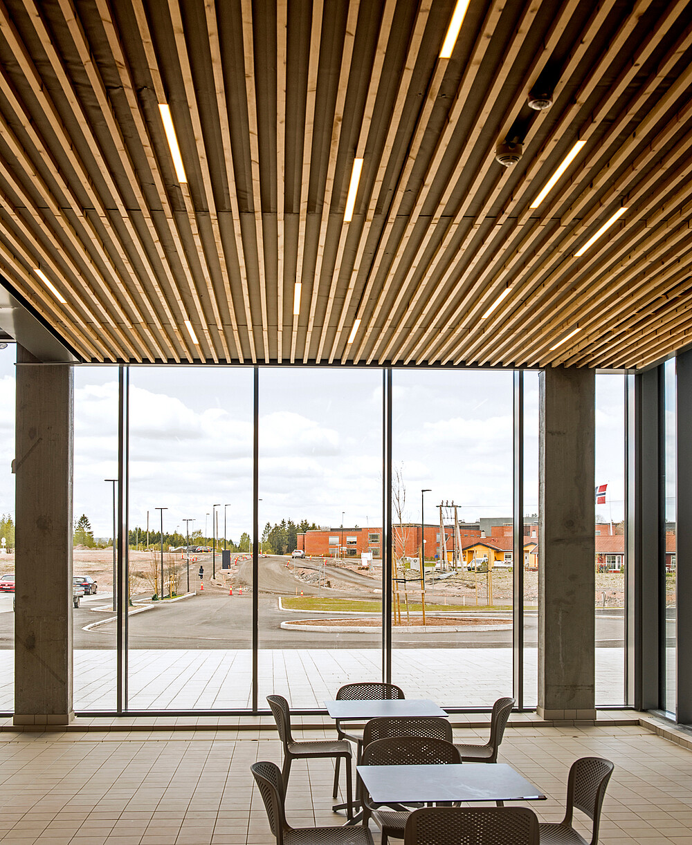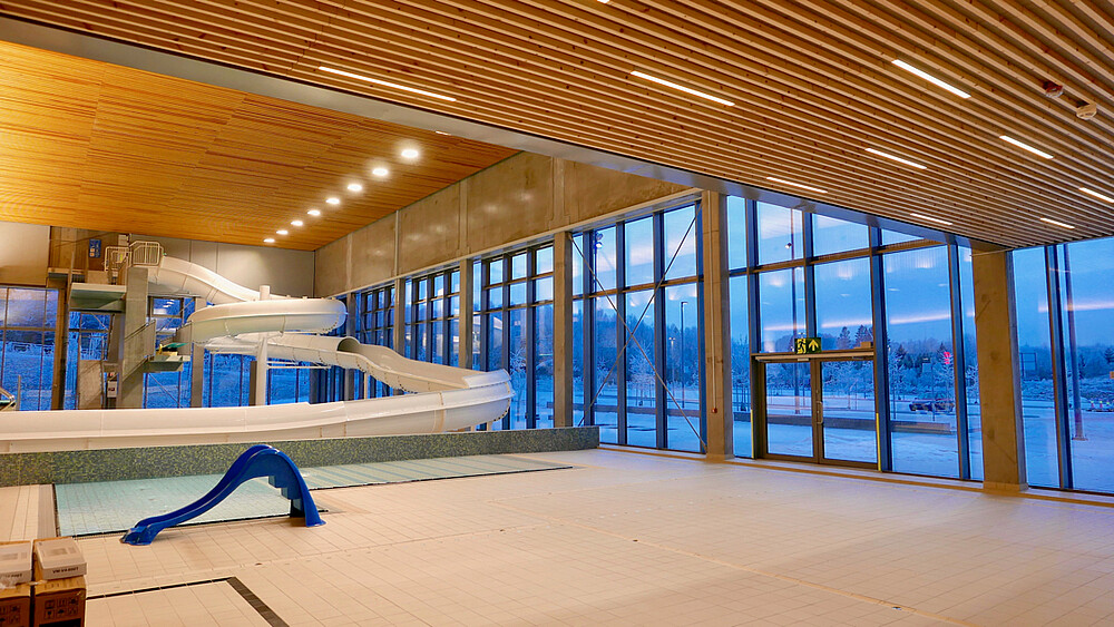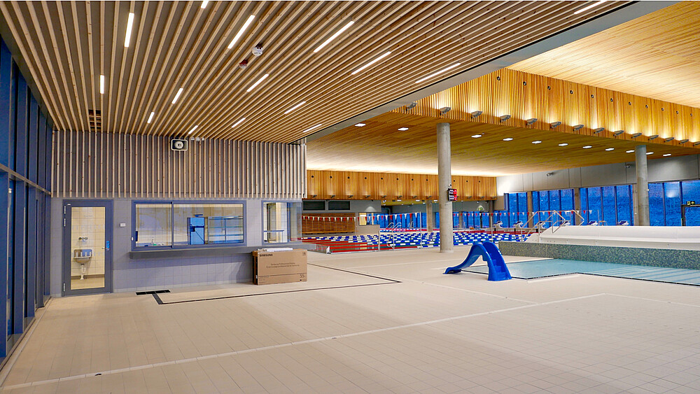 The Røykenbadet is the largest public health facility in the area with 9000 m² and includes swimming pool, fitness center, climbing facilities, cafeteria and various health services. In the modern bathing and swimming pool there are five different pools and a 60-meter water slide. The hall is modern, with high windows and a wooden paneling on the ceiling, it looks open and friendly. The linear luminaire XOOLIGHT™ was integrated into the ceiling. The luminaire body with a width of 42 mm is just as wide as the wooden beams and therefore harmoniously fits into the ceiling. An interesting symbiosis of the different materials. An IP67 solution has been chosen for the use in the swimming hall, which meets the environmental requirements. Thanks to the opal encapsulation the light is absolutely homogeneous and point-free, which creates an appealing general lighting. Also in the cafeteria of the facility are the linear lines. The cafeteria is a meeting point for the visitors, the light lines support them with the orientation and make it possible to easier differentiate the areas visually.