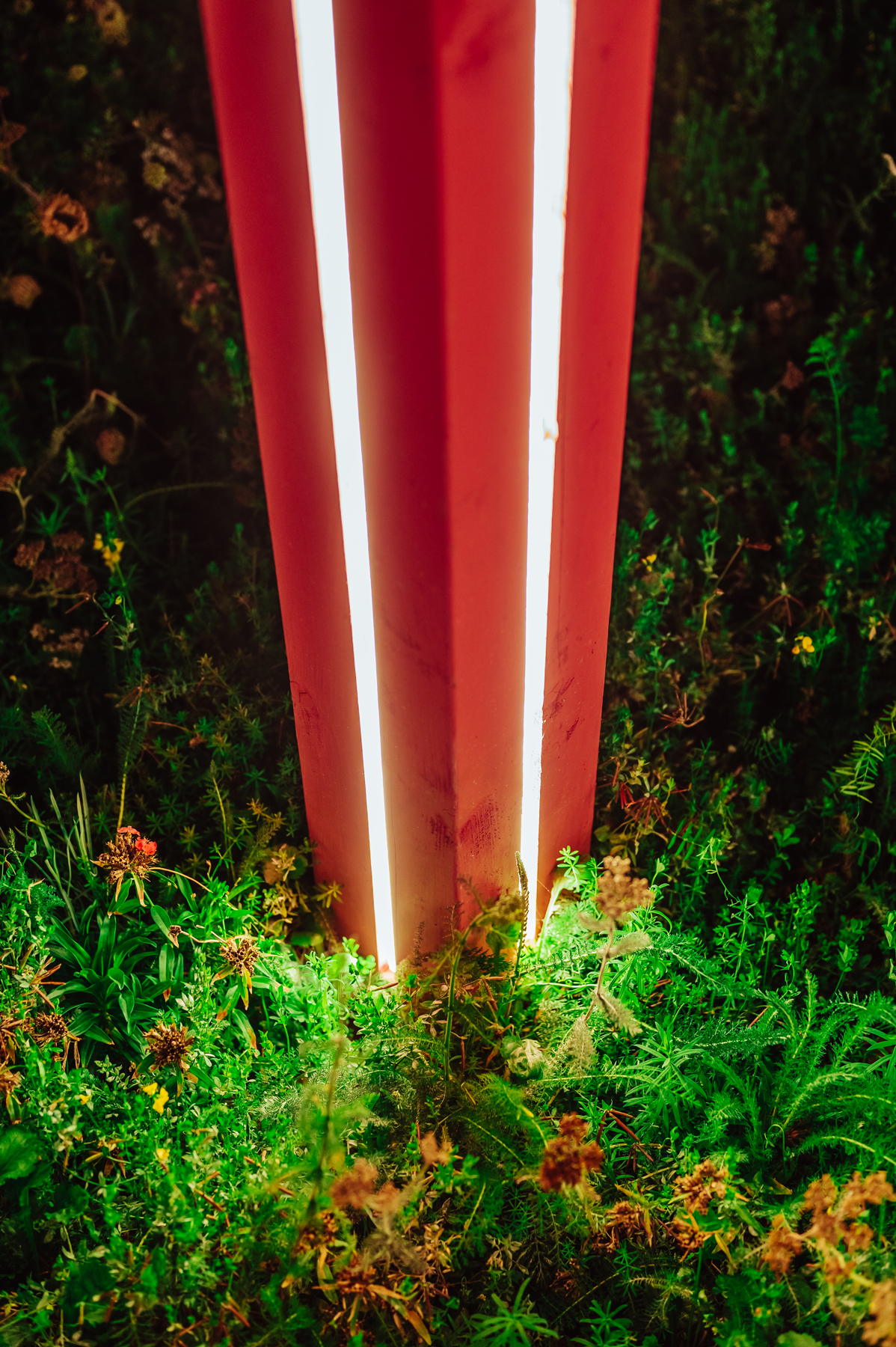 At night, the space is transformed by glowing light installations that mark the entrance to the park. About 2 meters pieces of LED Linear's VENUS TV in 2.500 Kelvin were placed into metal channels which were then recessed into routed channels within tilted wooden landforms created from site-reclaimed timber.