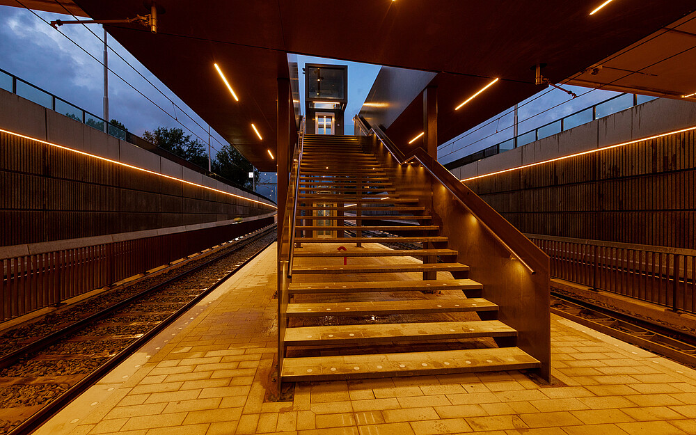 What is most characteristic about these stops is that they are situated inground. The separation from other traffic creates an increased sense of safety. This comfortable feeling is further enhanced by the warm light in combination with the walls in a copper look.