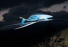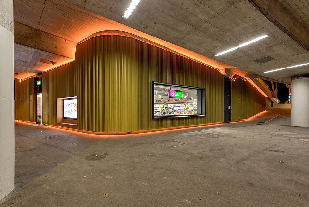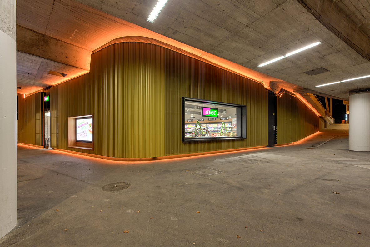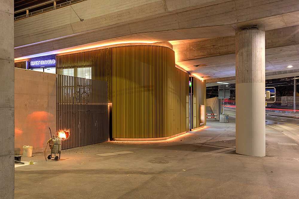 The technical installations for the operation of the traffic over the bridge are housed in the so-called abutment. The attractively designed abutment now also houses a shop and a café. The façade consists of folded expanded metal in golden color which is accompanied by the light color. The lighting starts in twilight in white and slowly changes to gold at midnight to be white again until dawn. The lighting control was realized by SE lightmanagement.