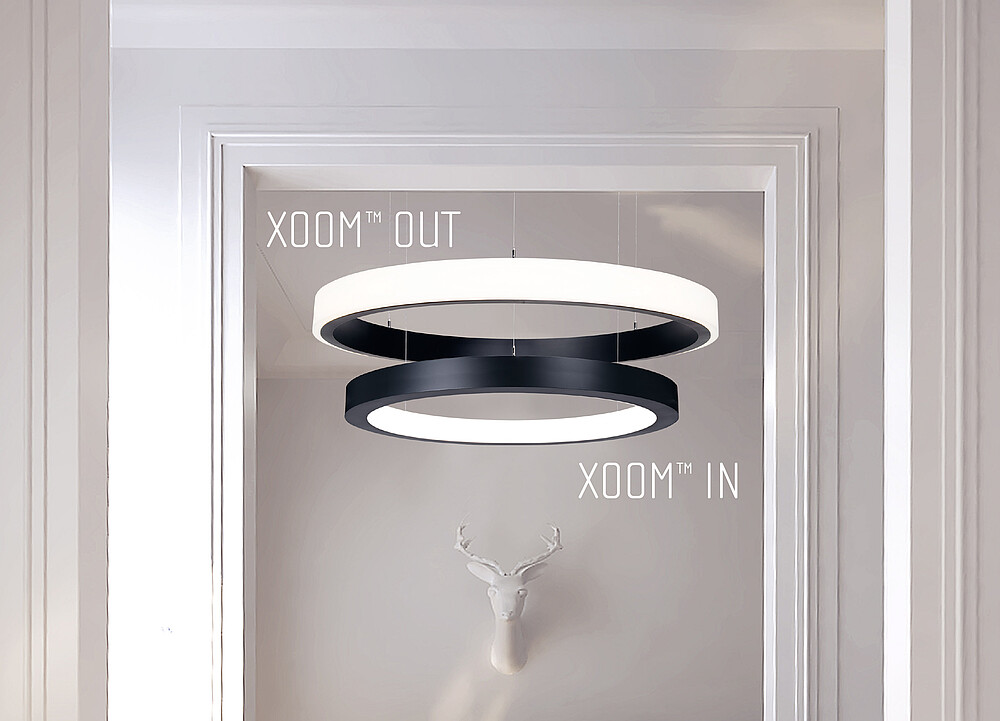 Immerse yourself by a gentle blend of light and shades. XOOM IN and XOOM OUT impress by their homogeneous ring of light integrated in aluminum circular housing which is available in a diameter of 1m (3,28’) and 1,4m (4,59’).