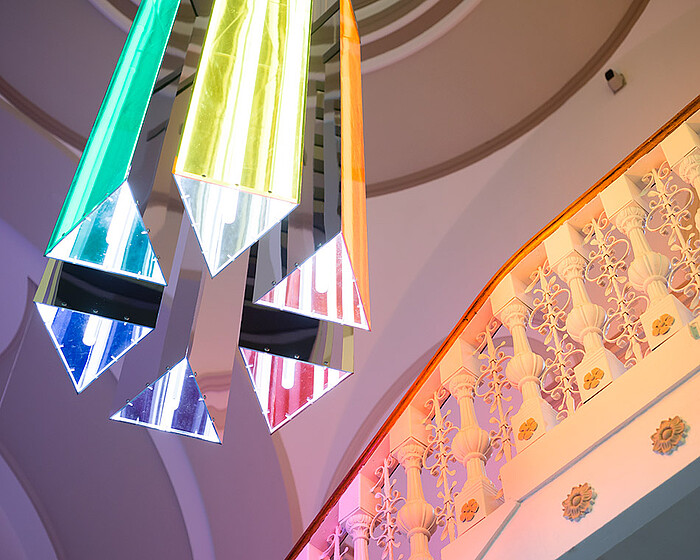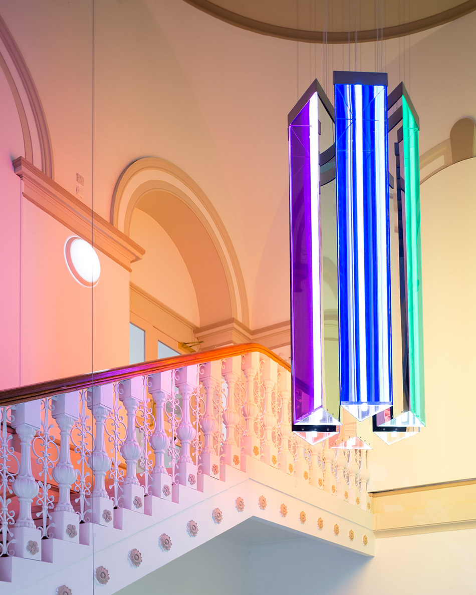 Light is essential to Liz’s work. Sevenfold takes its reference from Newton’s rainbow sequence of red, orange, yellow, green, blue, indigo and violet. Seven (six prisms in the main installation plus one mini prism above the reception desk) individual and vast prisms have been created that use mirrors to further radiate colour and reflect elements of the beautifully restored architecture. As visitors ascend the staircase they find themselves at eye level with the artwork, giving the chance to marvel Sevenfold at its luminous best.