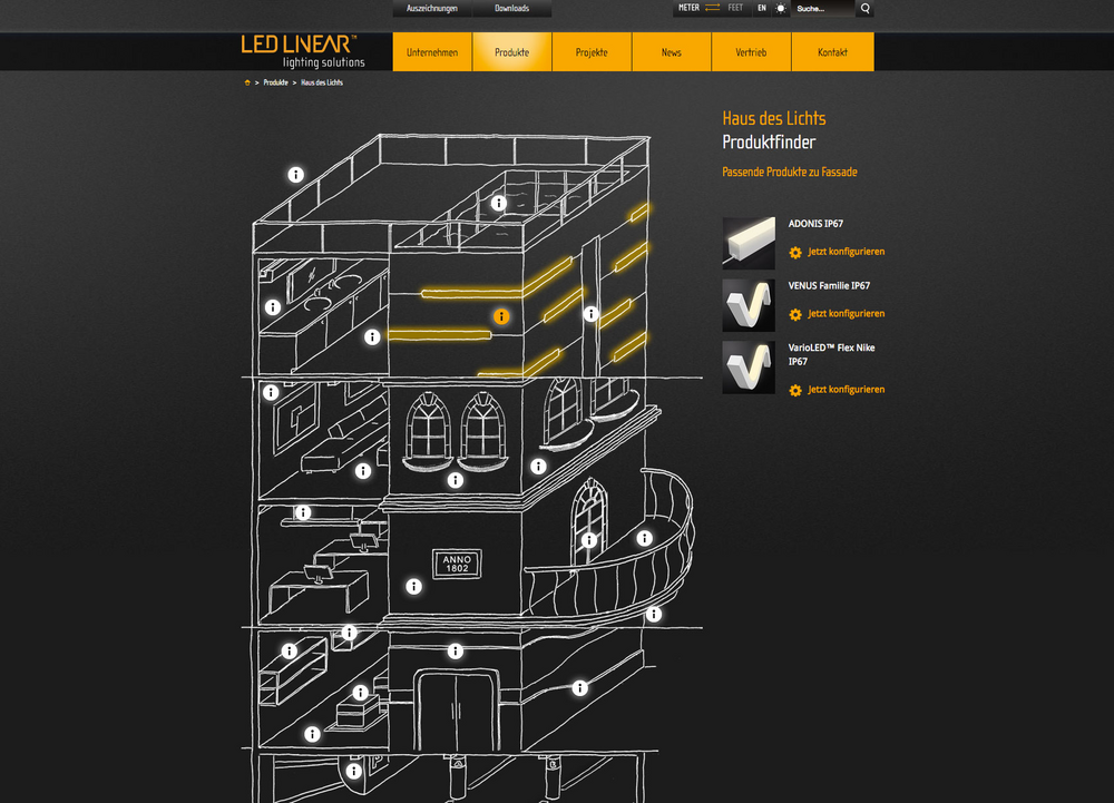 Or do you want to be guided visually and find the right luminaire on different floors and rooms? Then let yourself be inspired in the "House of Light" and choose your product by application. We automatically offer a choice of up to 4 luminaires to match the selected application, and you can jump directly from this menu into the configuration.
