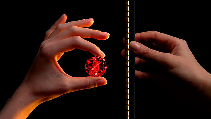 Citation Light On: "With its combination of warm white/cold white light colors (2,700 K and 5,000 K), the micro light decomposition looks like a multitude of small suns that make the gemstone facets glow with thousands of rays. Jewellery and gemstones literally sparkle at you when you walk past the shop window or display cases. You can already test this effect with an inexpensive, cut zircon”.