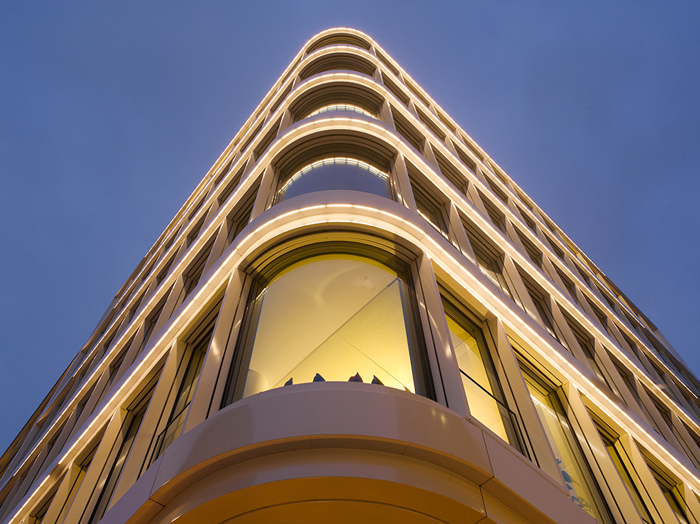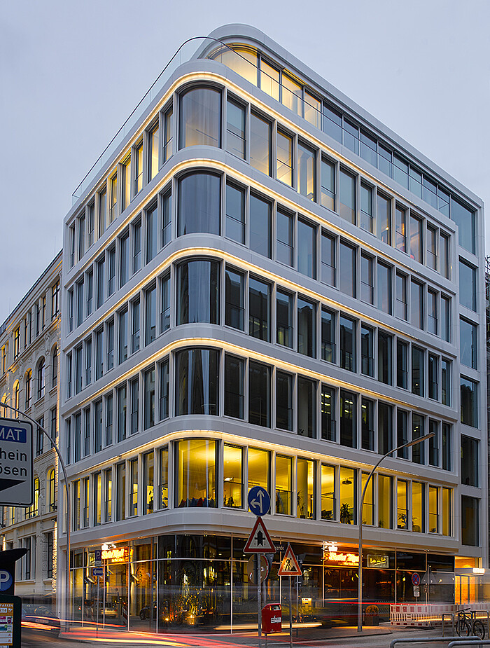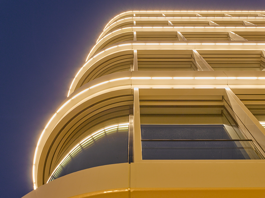 Peter List: At the Baltic House, it was the challenge to emphasize the architecture and to give the round corner of the building a special significance. The clear division of the stories should also be highlighted by linear lighting. This lining was the lighting planning template, which provided the idea to use light lines very fast. In the beginning, the question was, "How can light be represented?" There must be a surface on which the light reflects. The luminaires should not be visible, the architecture should be recognizable. We therefore opted for a lighting solution that can be integrated into a joint. Another requirement of the city's gremium was a brightness gradient in the lines. This brightness can be achieved with many partial lengths of 30 cm. Each partial length has its own address in the light control unit and is controlled separately. There are in total 420 luminaires. The sections at the corner get 100%, to the ends they are dimmed - thus the decent light course on both building wings developed. Ultimately, however, every project is a challenge. We want to create something beautiful and emphasize the architecture, this is what we stand for.