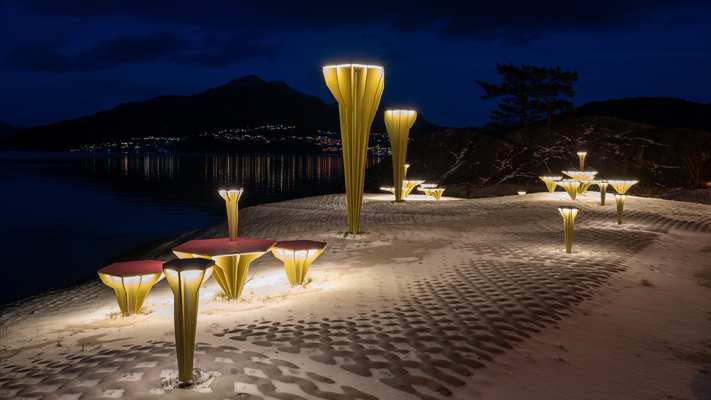 In 2021, small and large furniture elements such as stools and tables were built from materials from recycled plastic boats from Ryfylke, as well as lanterns and lamps. They now stand as clusters of artificial “mushrooms” in the rest area. In the evening hours, the square is transformed and the mushrooms start to glow, almost to float. The effect was achieved with the VarioLED™ Flex IP67 light line, which indirectly illuminates the undersides of the recycling objects.