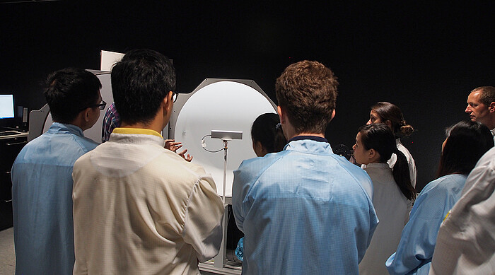 Particular attention was devoted to the topic of innovation. The students learned how the company optimizes processes and holds everything continuously on the cutting edge of technology. To illustrate this, the Goniophotometer "Robogonio" from Opsira was demonstrated in the light laboratory. Due to the flexibility of this robust 6-axis industrial robot it is possible to combine several types of goniometers and light measurement applications in a high-precision instrument and therefore to perform light measurements at the highest level.