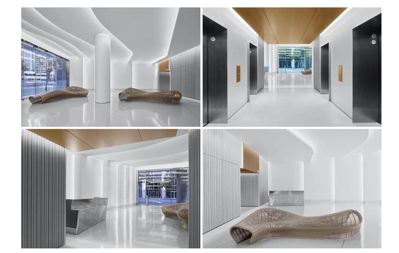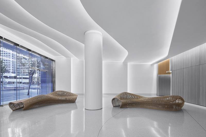 An aquatic metaphor finds resonance in all aspects of the lobby's design, from light and materiality to the furniture selection. Scalloped layers of sanded plaster provide a dramatic backdrop at the ceiling plane, further emphasized by lines of light. Here the VarioLED™ Flex HYDRA LD15 W835 with an opal lens was used. The reception desk area was illuminated with VarioLED™ Flex PHOBOS TV in W827, creating a soft warm light.
