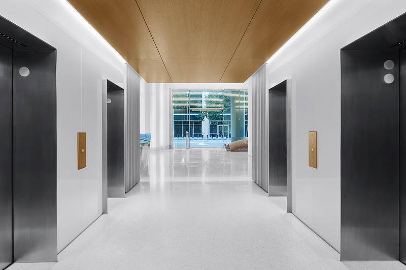 As light filters through the building façade throughout the day, interior lighting levels correspond, creating a different, dramatic impression each time one traverses the lobby.