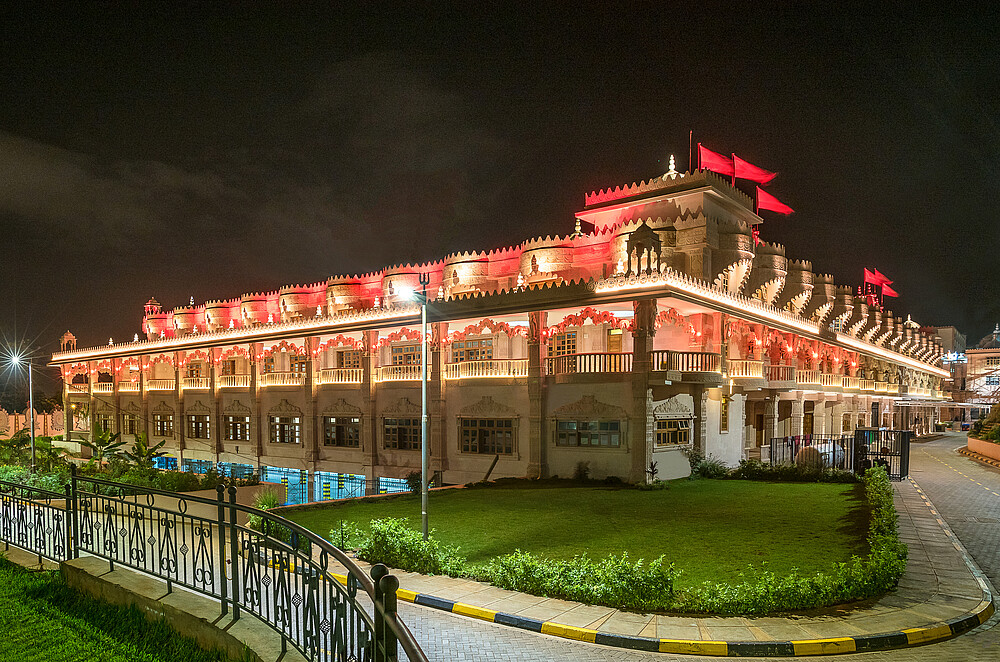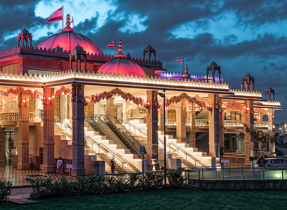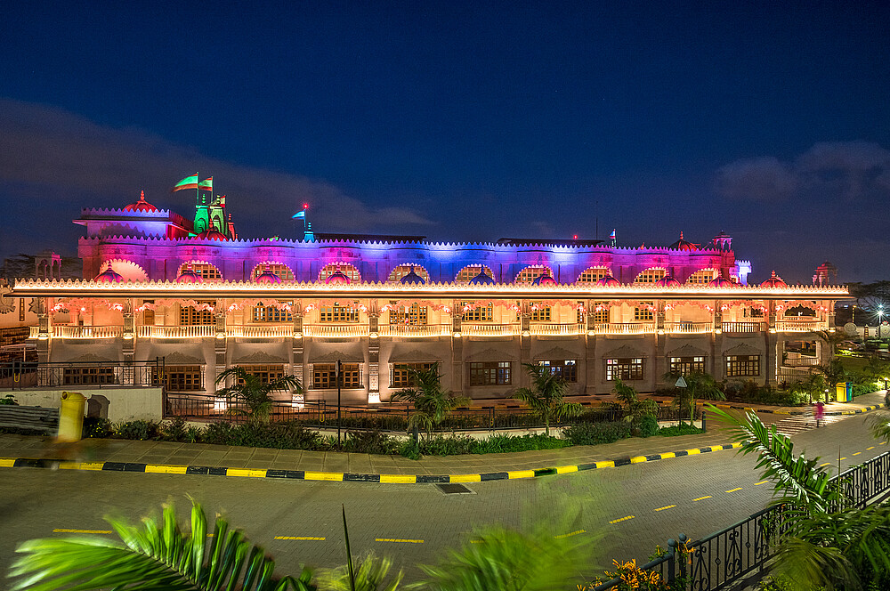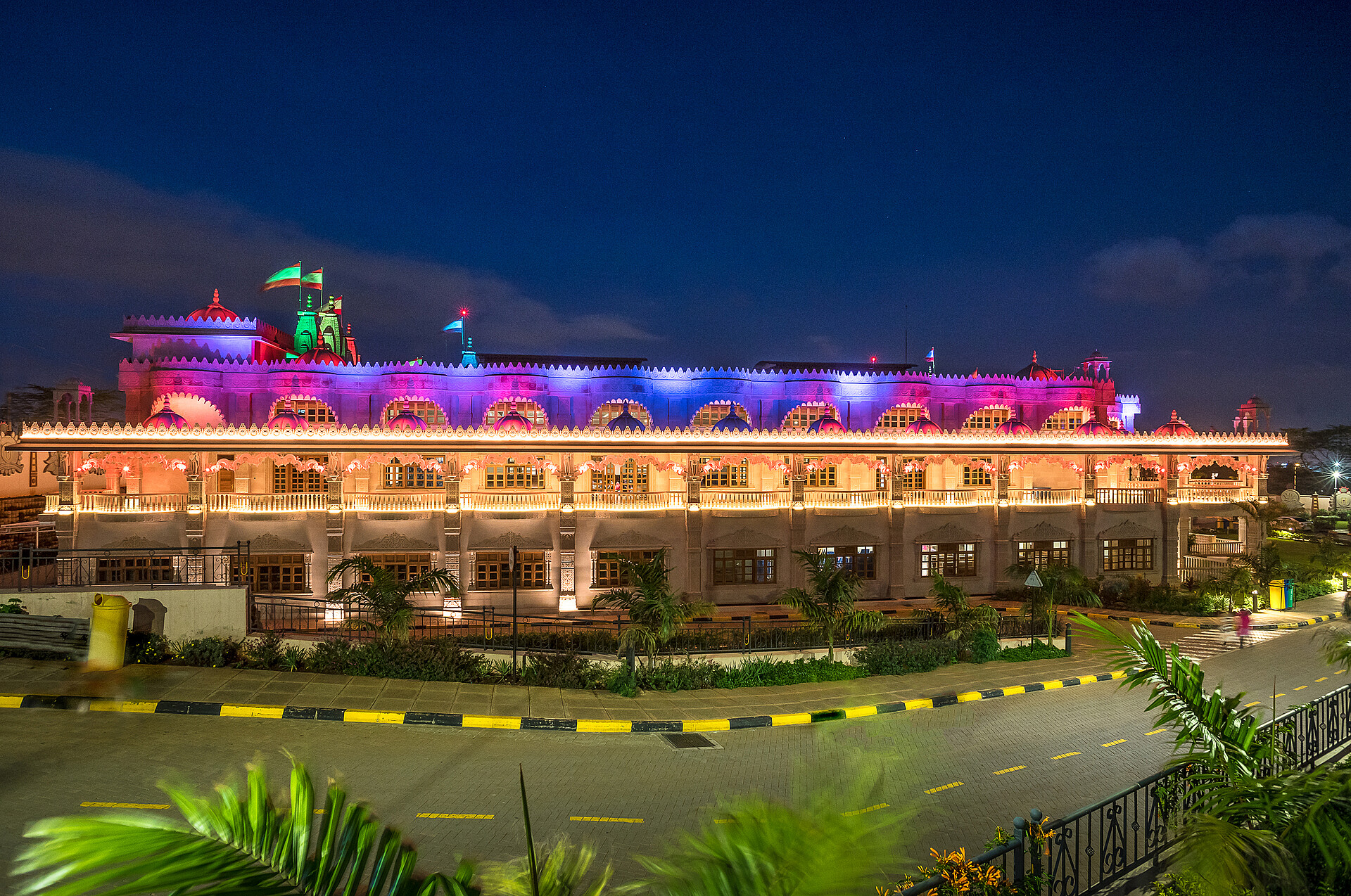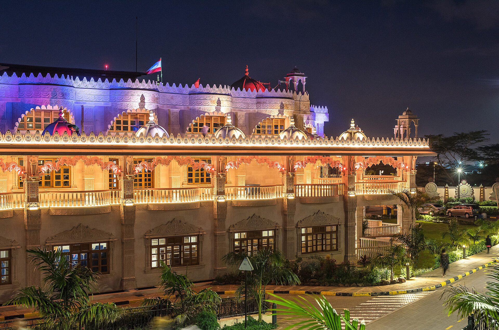 The Swaminarayan Temple in Kenya was built in year 2017 by the community of Swaminarayan. Its located at Langata Road, a highly frequented road, which is very popular for tourists because of its high amount of restaurants and malls. To highlight the diverse and different facade art of the temple, it is architectural illuminated, so arcs, facades, balconys and pillars, glaring in warm colors, appering three-dimensional.