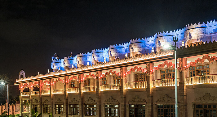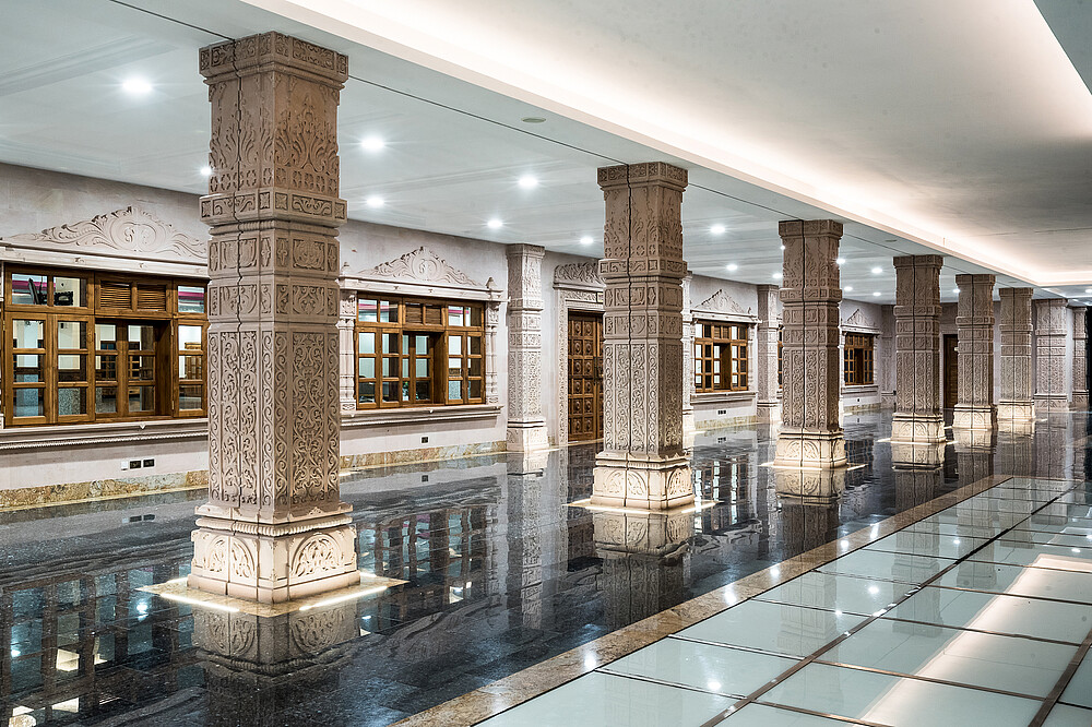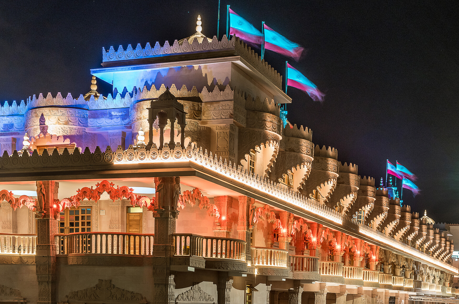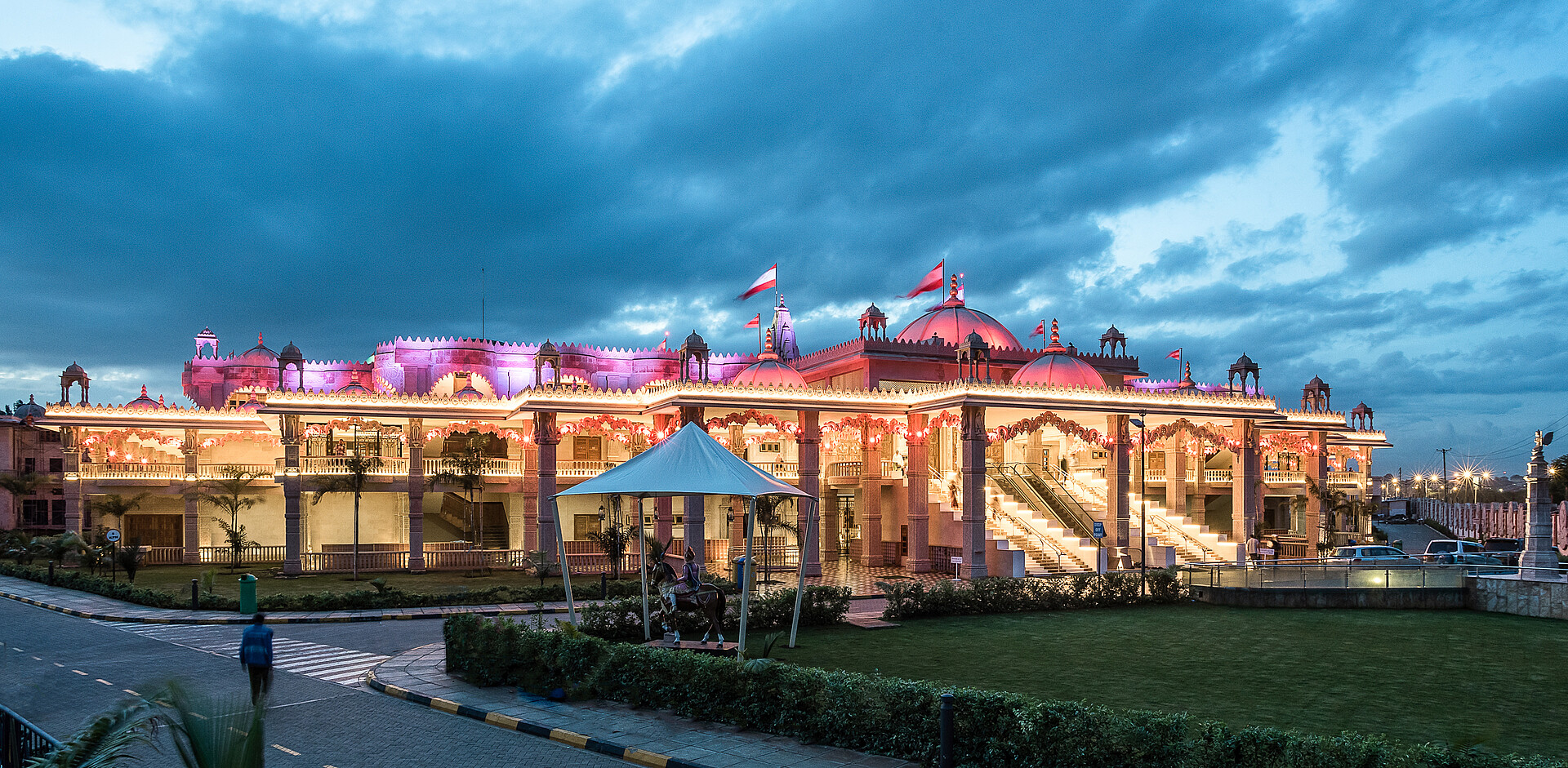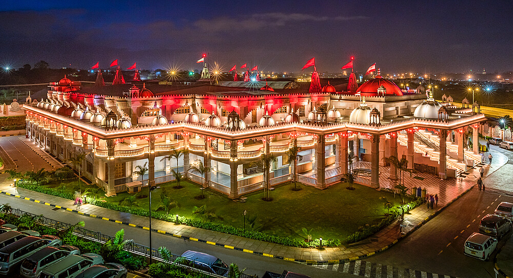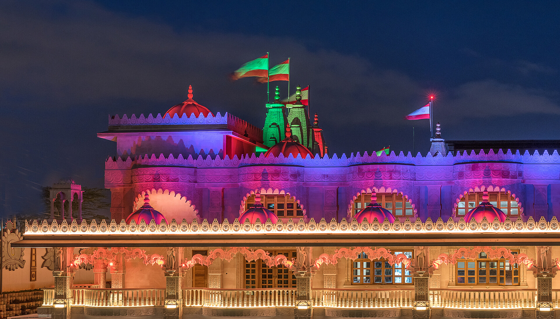 The Swaminarayan Temple in Kenya was built in year 2017 by the community of Swaminarayan. Its located at Langata Road, a highly frequented road, which is very popular for tourists because of its high amount of restaurants and malls. To highlight the diverse and different facade art of the temple, it is architectural illuminated, so arcs, facades, balconys and pillars, glaring in warm colors, appering three-dimensional.