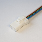 Click on connector with 4 pins for flexible, RGB LED tapes with a width of 9.5 mm / 0.37". 500 mm / 19.69" open cable ends (4 x 0.34 mm2). Direct plug-in method. 10A max. current. (L x H x W) 8 mm x 4.8 mm x 9.2 mm / 0.35" x 0.19" x 0.36"