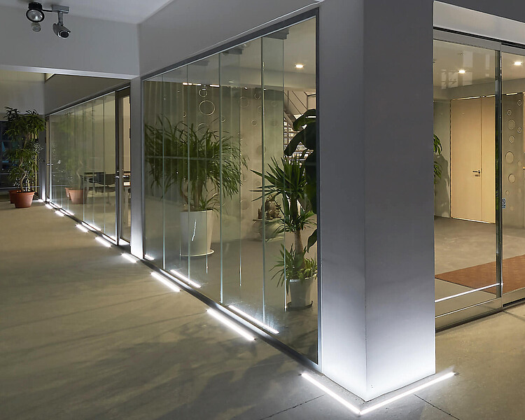 Luminaires installed in robust in-ground channel for installation in concrete, wood, ceramic or carpet floors with drainage compartment and water outlet.