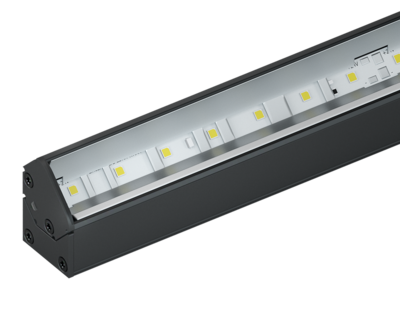 Surface mount wall washer with small form factor using specular reflector offering a variety of lumen outputs from 380 lm/m up to 4,130 lm/m and CCTs.